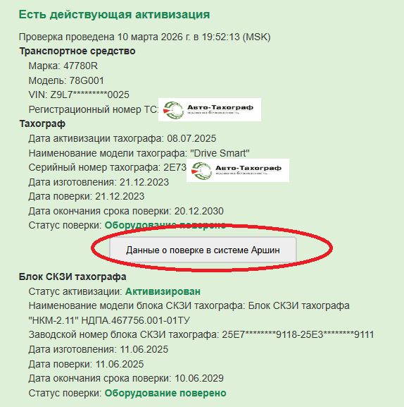 Если в карточке тахографа присутствует кнопка «Данные о поверке в системе Аршин», это означает, что метрологическая поверка тахографа проведена и информация внесена в государственный реестр средств измерений.